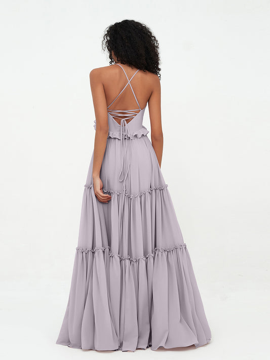 The perfect boho v-neckline sleeveless chiffon dress with spaghetti straps! The cascading cake skirt has a casual and unruly temperament, which is very suitable for prom. Delicate straps connect at the back in an overlapping zig-zag pattern, coming together in a sweet bow. Available...- $99.00