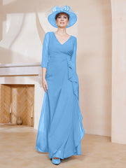 3/4-Length Sleeves V-neck Pleated Long Dress Blue