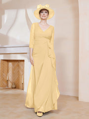 3/4-Length Sleeves V-neck Pleated Long Dress Gold