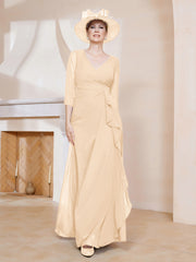 3/4-Length Sleeves V-neck Pleated Long Dress Peach