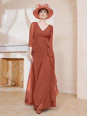 3/4-Length Sleeves V-neck Pleated Long Dress Rust