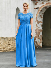 A-line Short Sleeves Lace Top Pleated Dress Ocean Blue