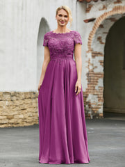 A-line Short Sleeves Lace Top Pleated Dress Orchid