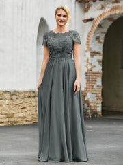 A-line Short Sleeves Lace Top Pleated Dress Steel Grey