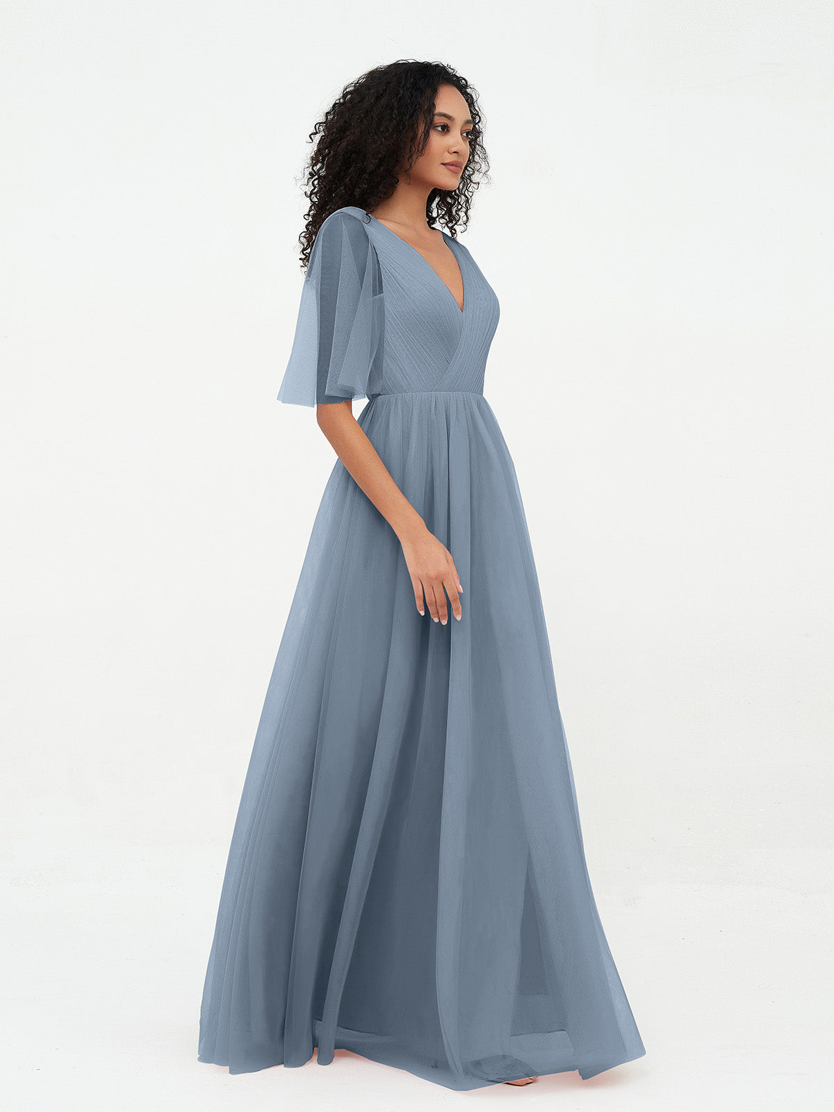 A-line V-neck Tulle Max Dresses with Deep-V Back-Dusty Blue