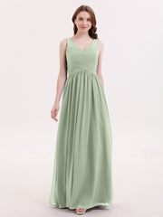 V Neck Chiffon and Lace Maxi Bridesmaid Gown Dusty Sage
