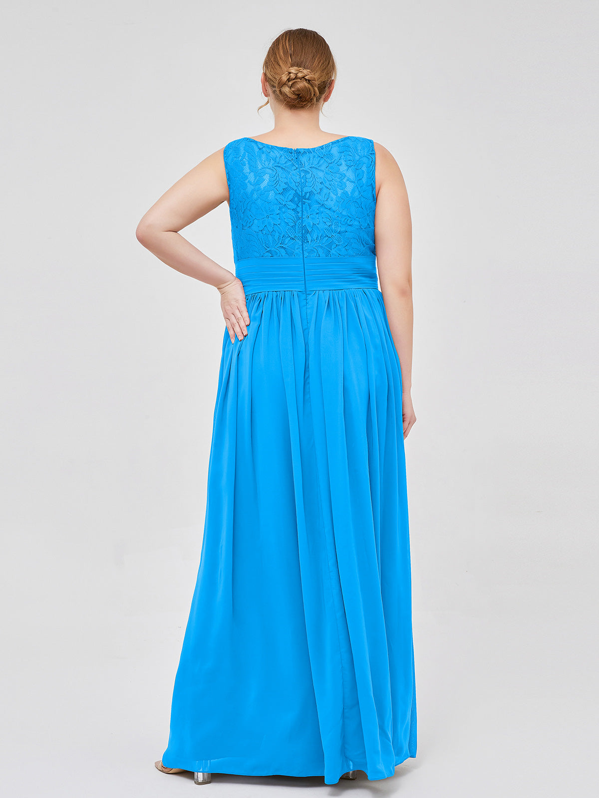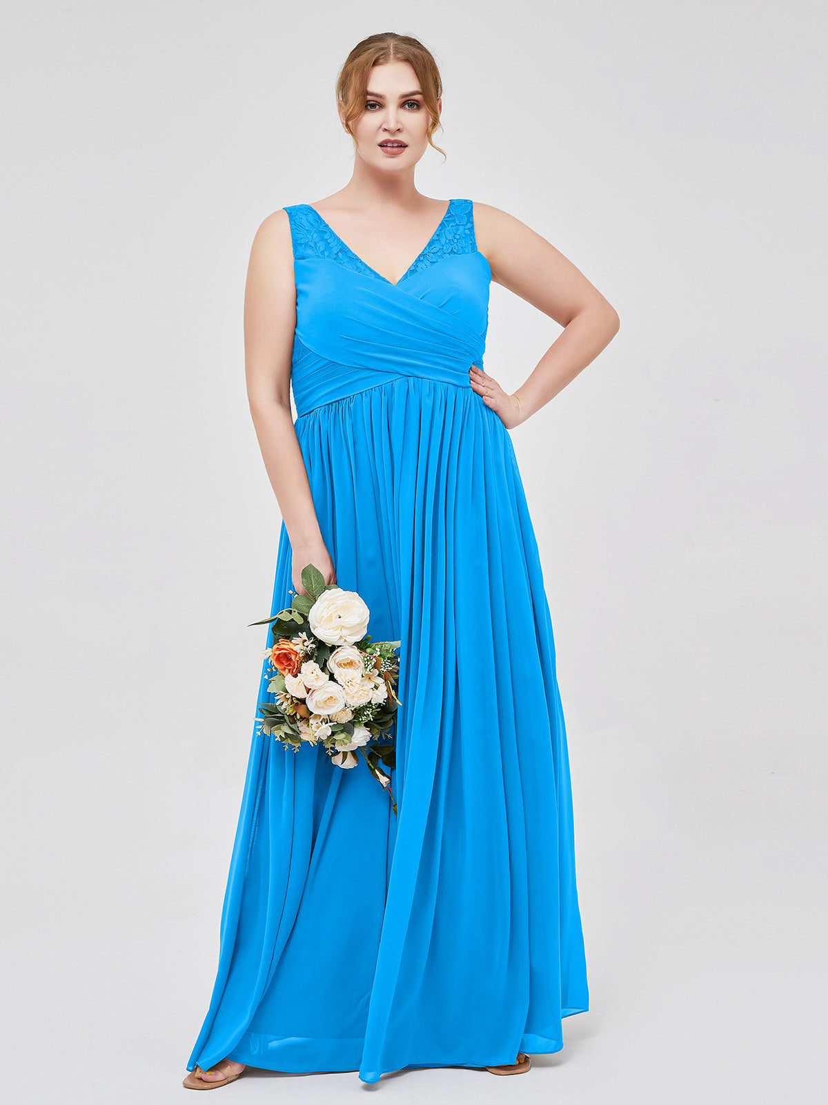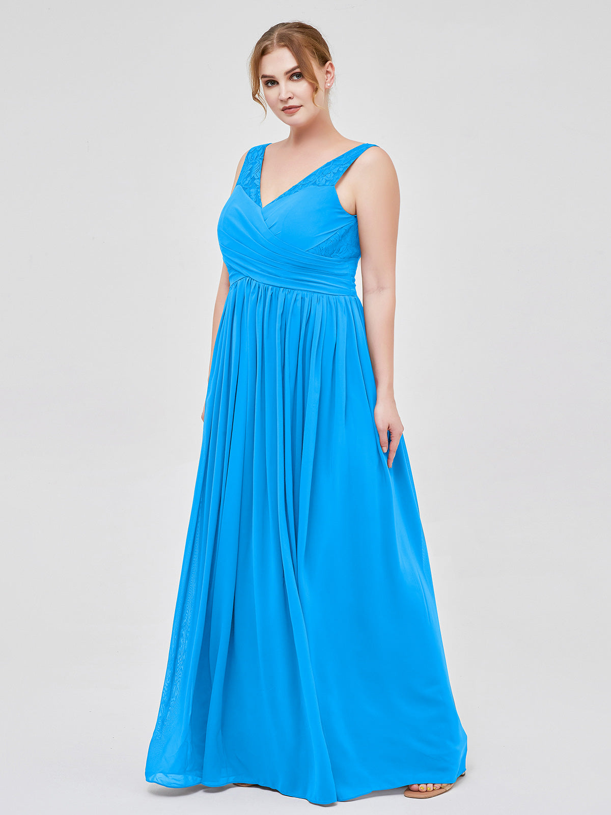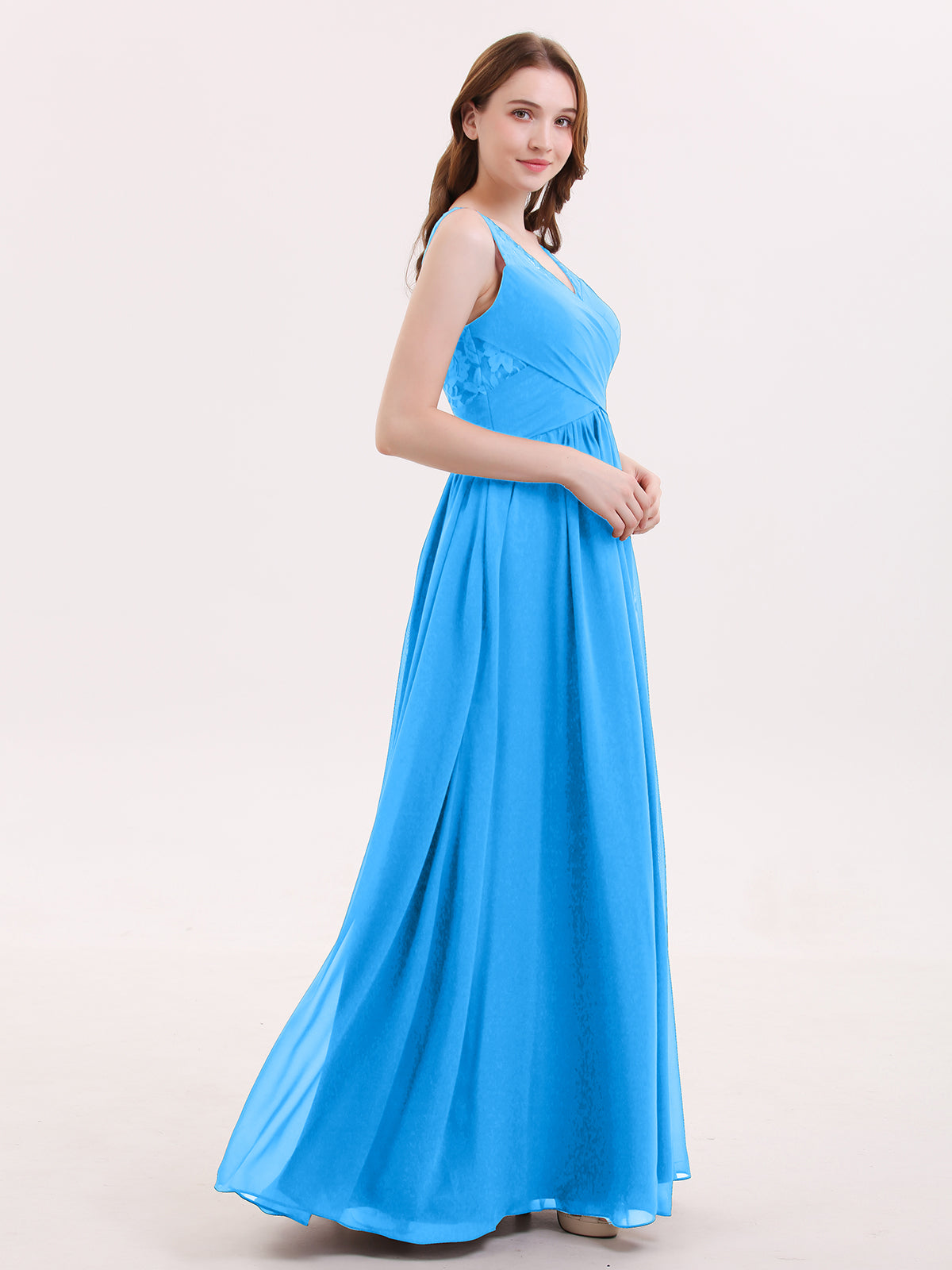 V Neck Chiffon and Lace Maxi Bridesmaid Gown Ocean Blue