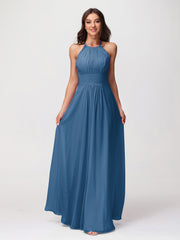 Halter Chiffon Long Gown With Lace Strap Ink Blue
