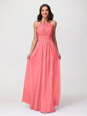 Halter Chiffon Long Gown With Lace Strap Watermelon