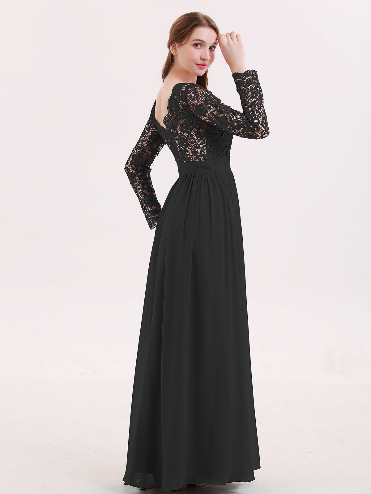 V Neck Lace and Chiffon Dress with Long Sleeves Black