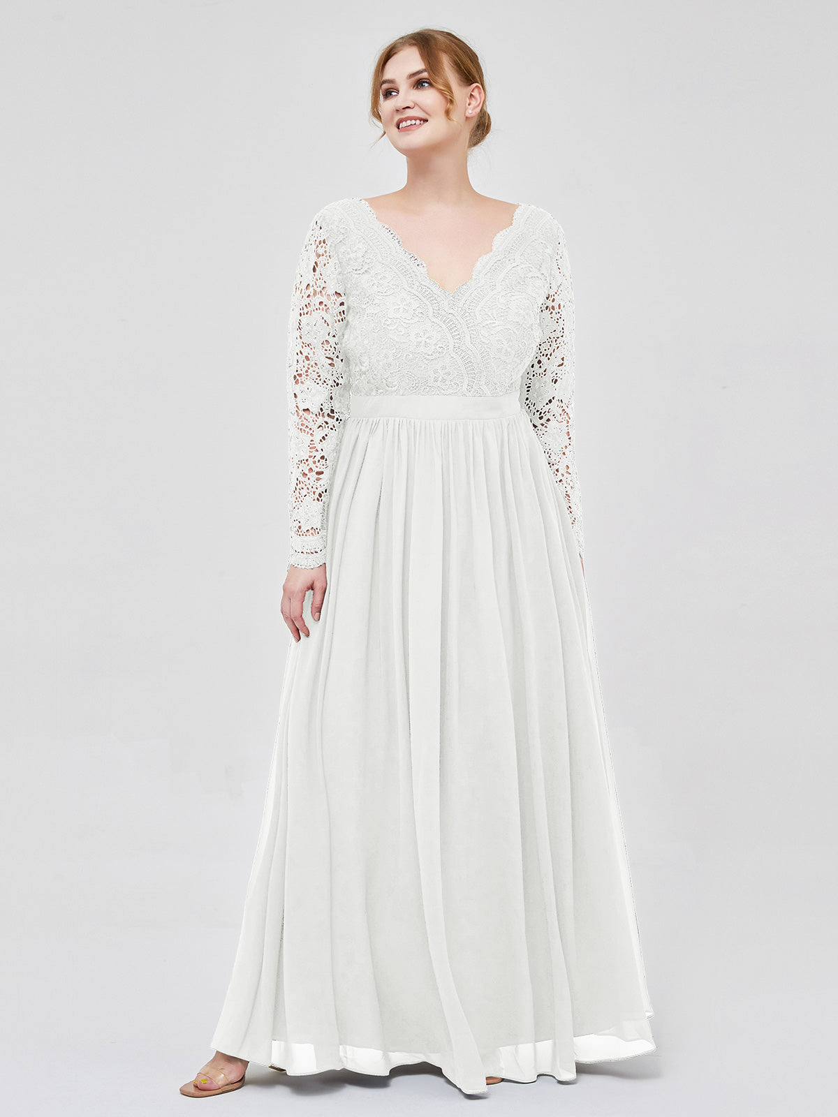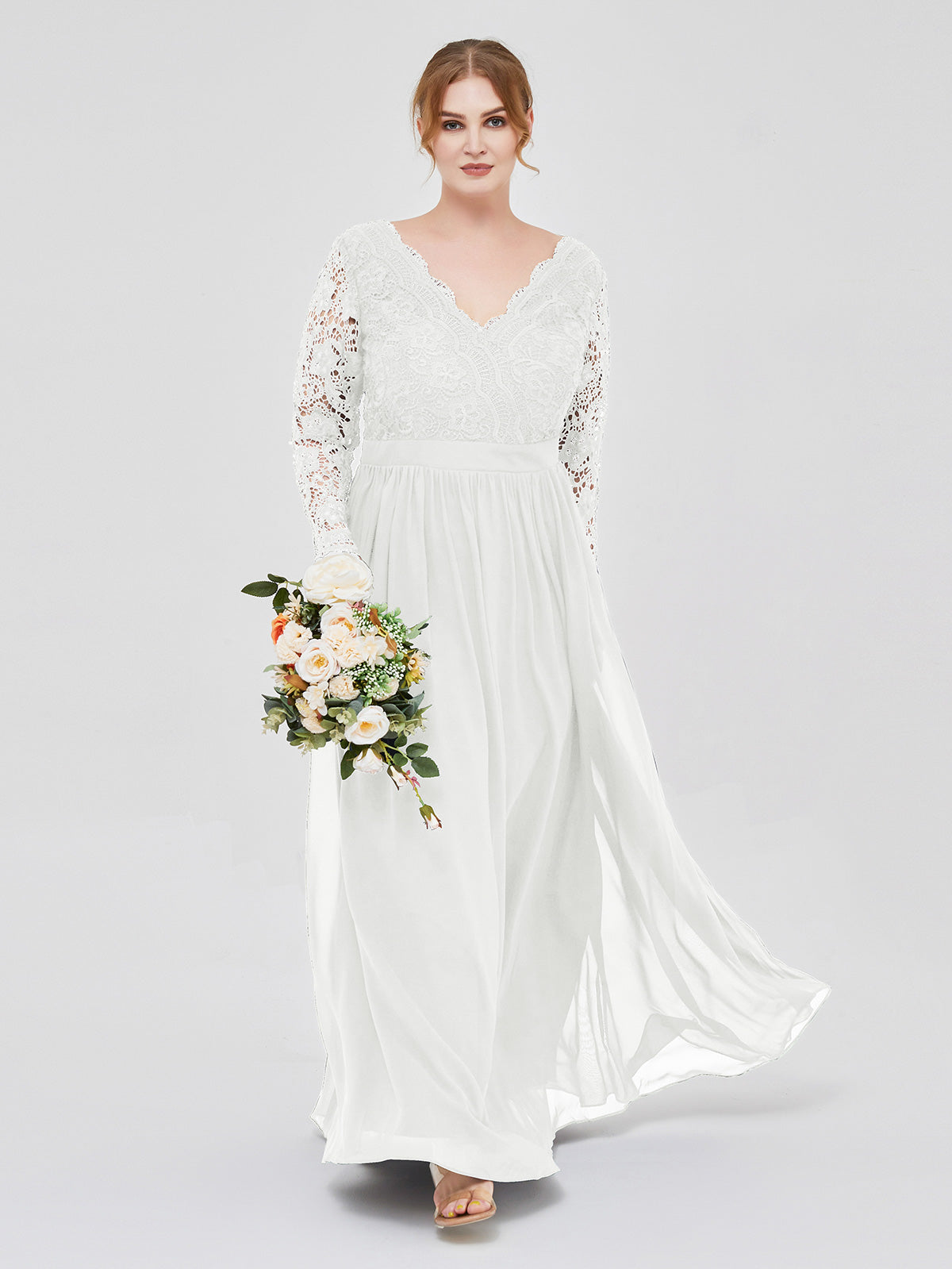 V Neck Lace and Chiffon Dress with Long Sleeves Ivory