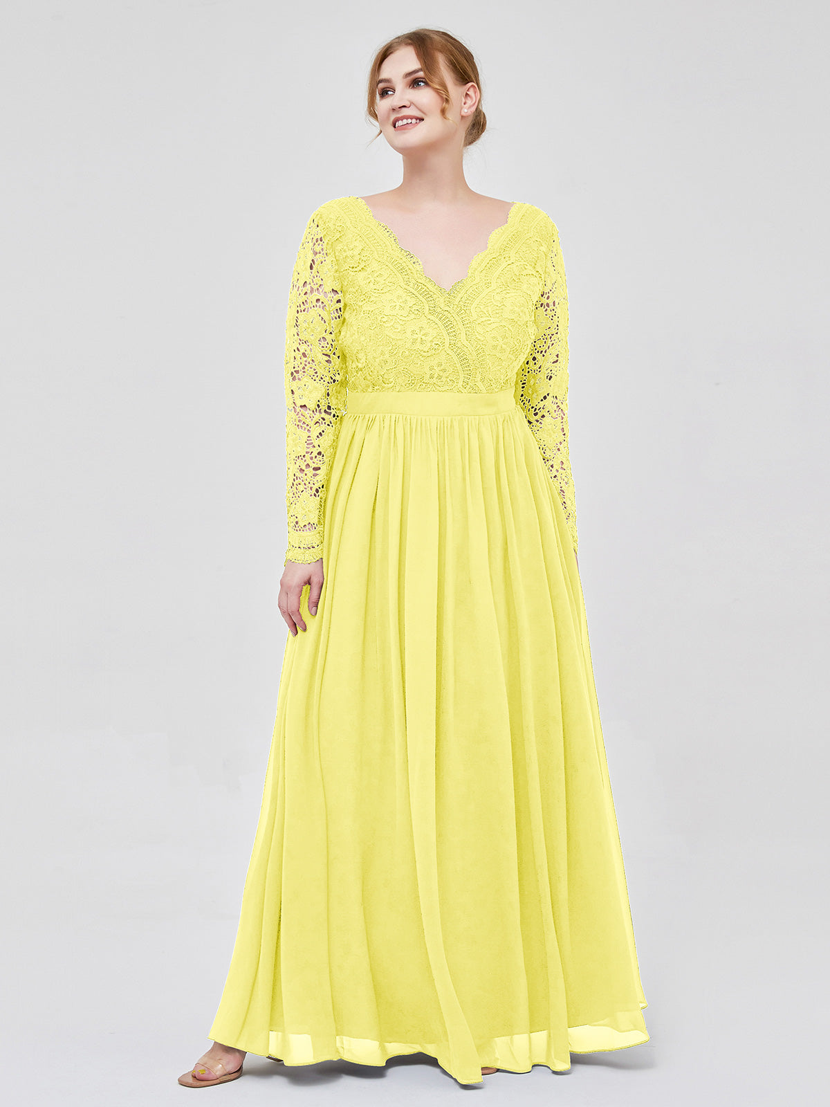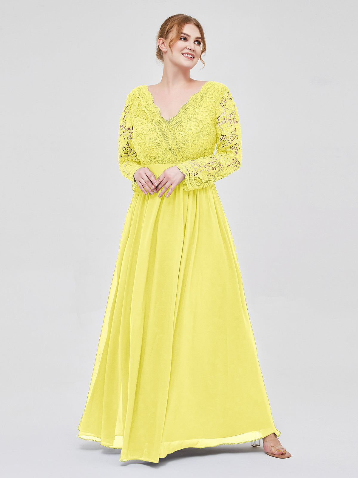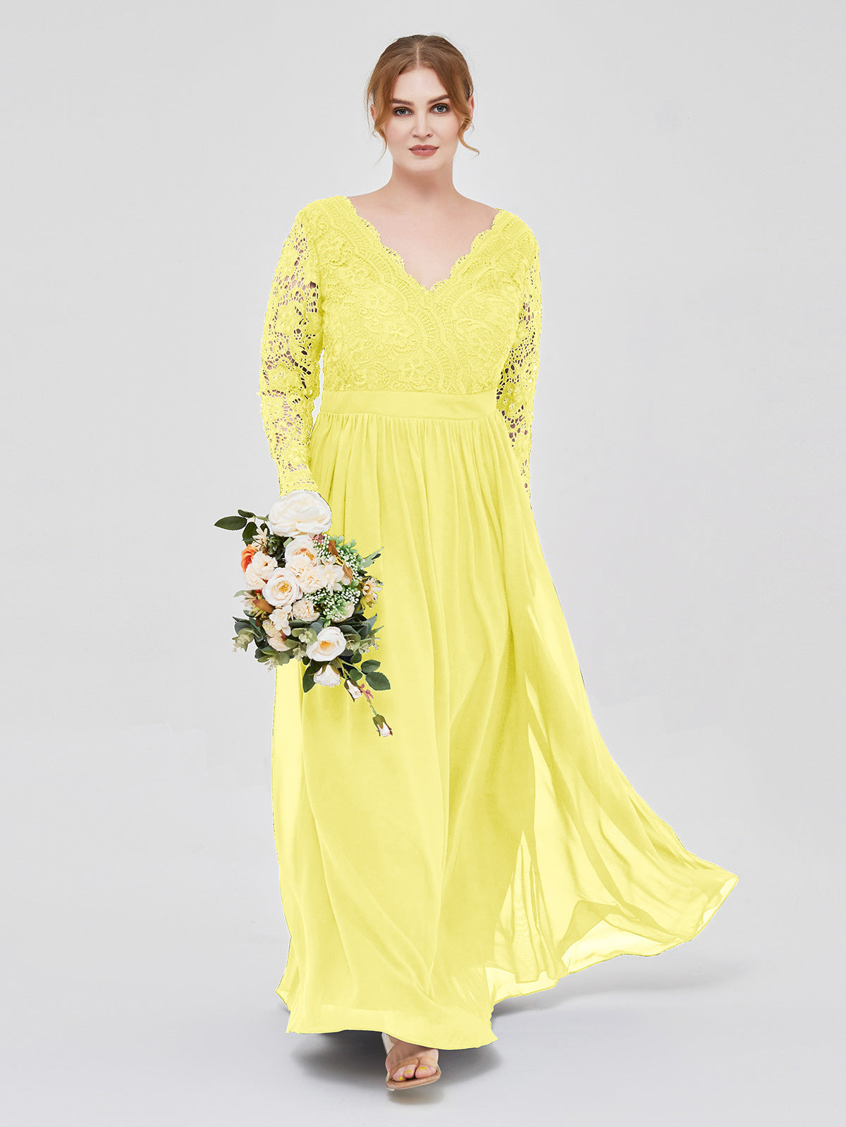 V Neck Lace and Chiffon Dress with Long Sleeves Lemon