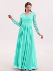 V Neck Lace and Chiffon Dress with Long Sleeves Spa