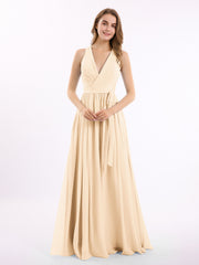 Deep V Neckline Chiffon Dress with Sash Bow Peach