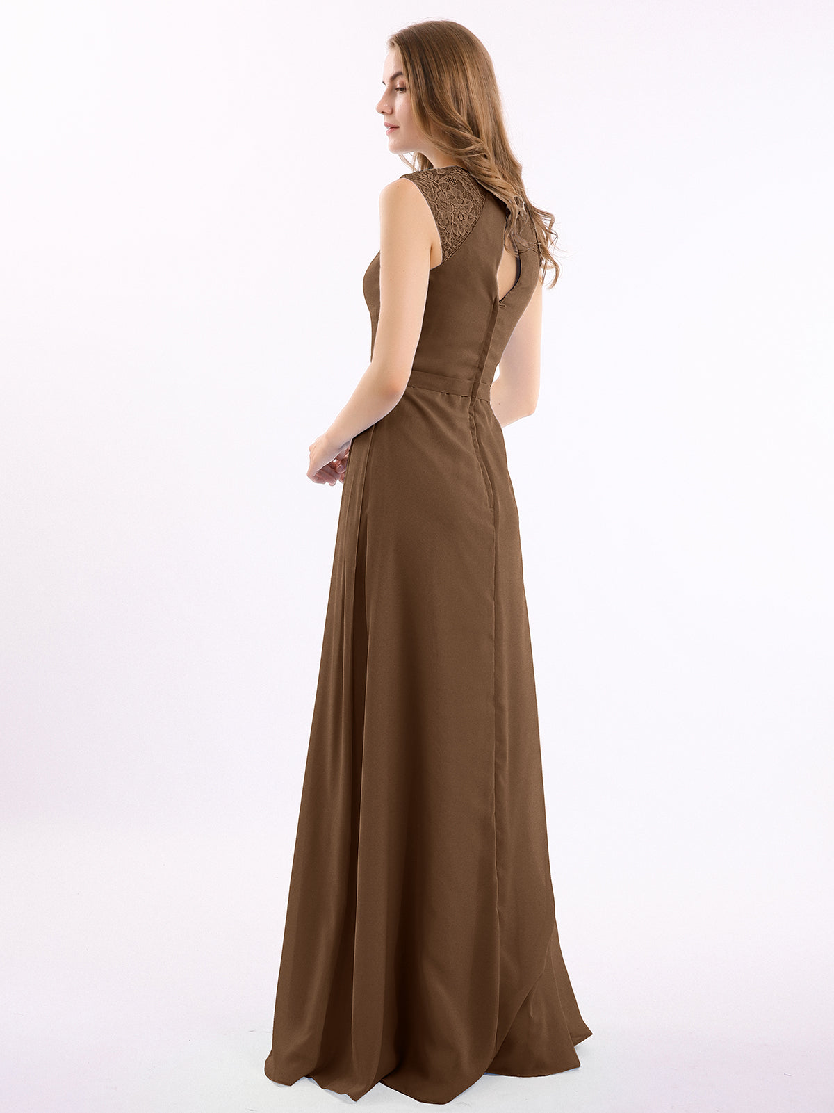 Chiffon and Lace Open Back Full Length Dress Brown