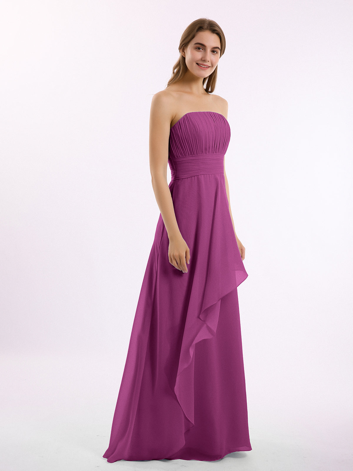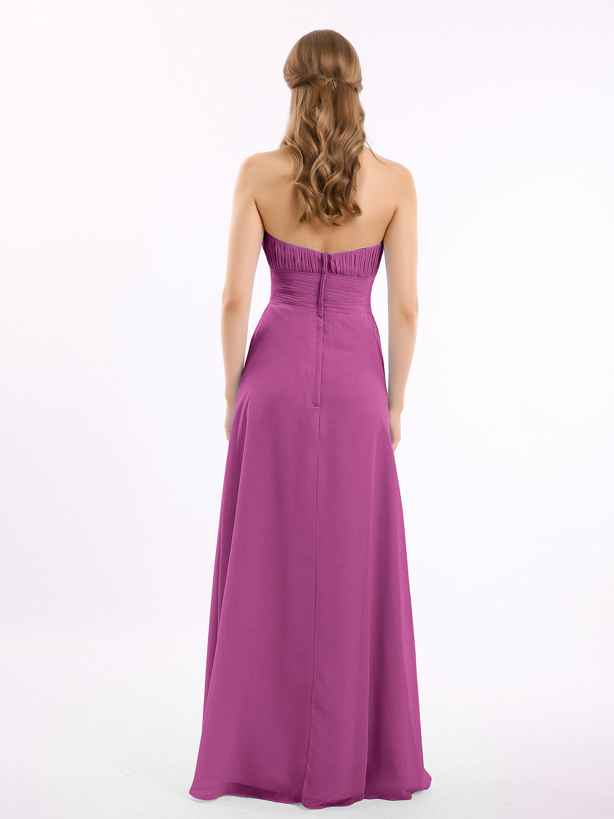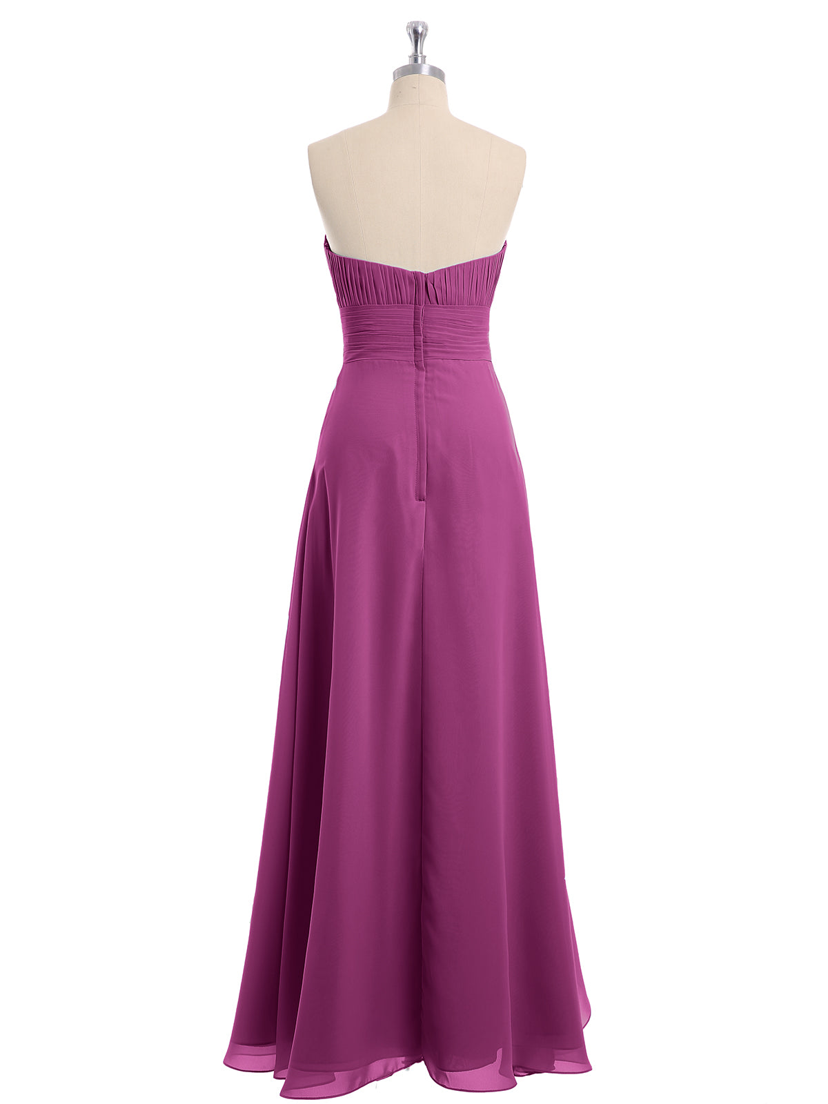 • It is floor-length with an uniquely pleated bodice and a strapless sweetheart neckline.