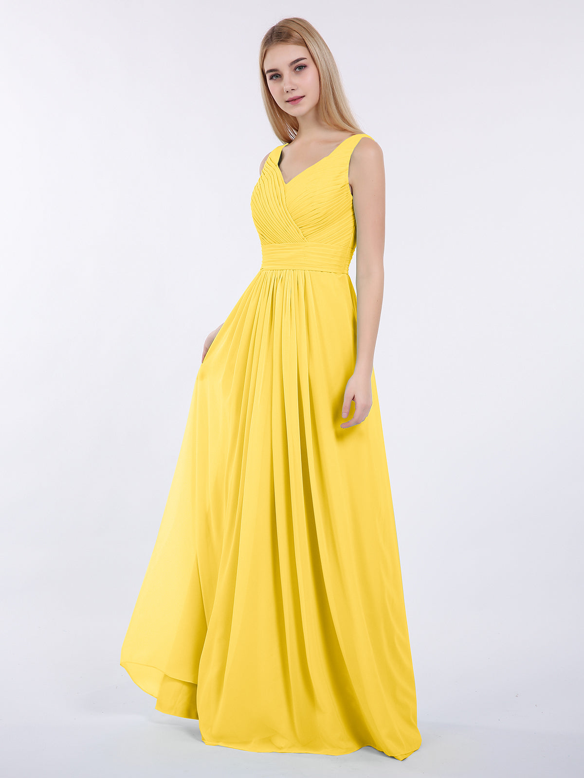 V-neck Full Length Chiffon Dress with Pleated Bodice Marigold
