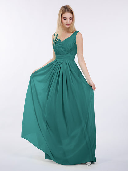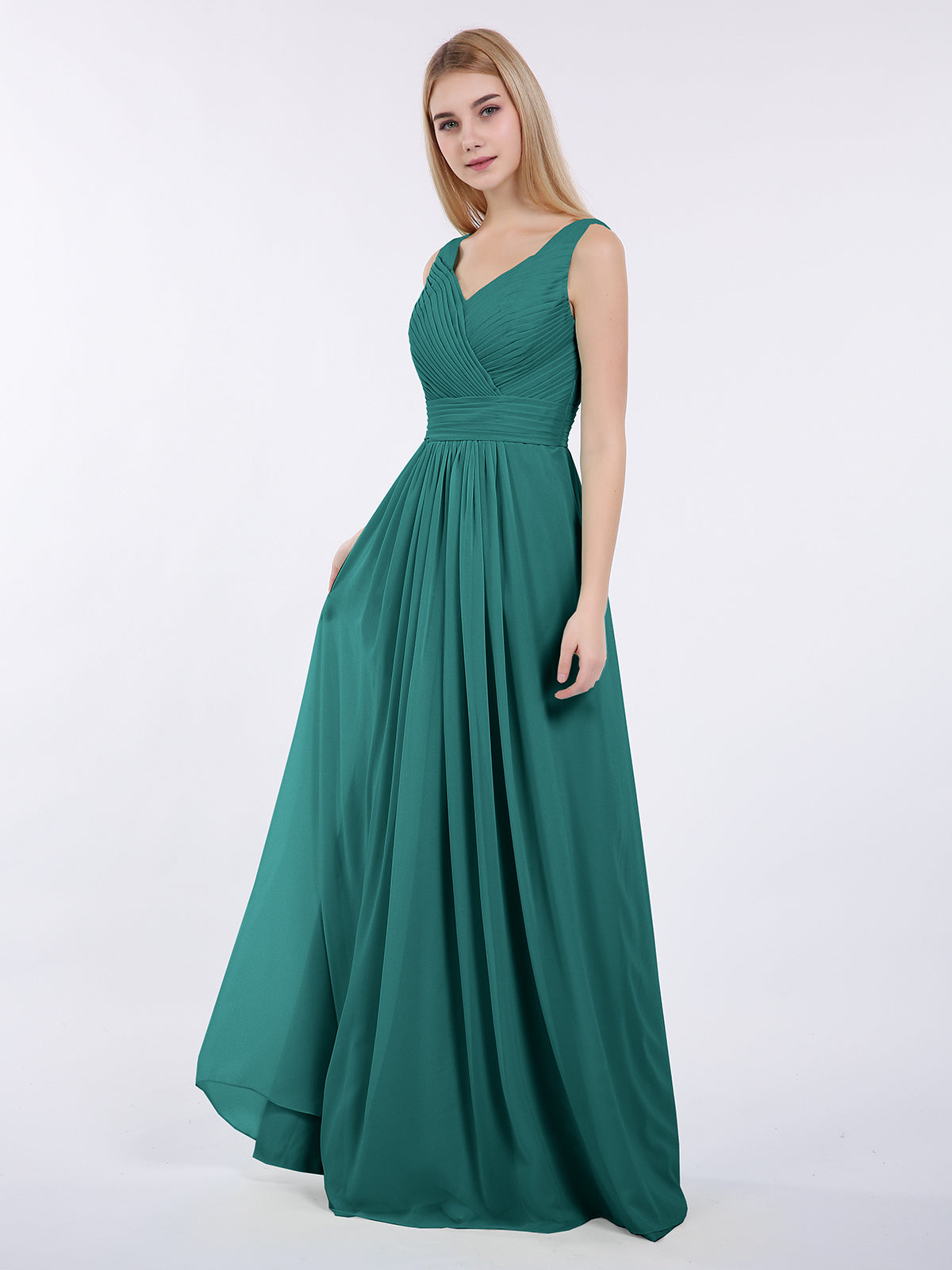 V-neck Full Length Chiffon Dress with Pleated Bodice Peacock