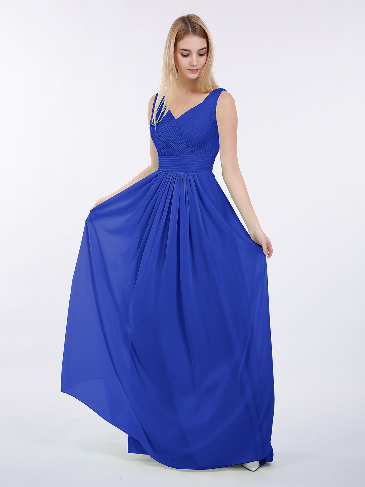 V-neck Full Length Chiffon Dress with Pleated Bodice Royal Blue