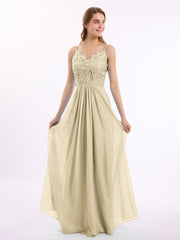 Lace and Chiffon Long Dresses with Spaghetti Straps Champagne