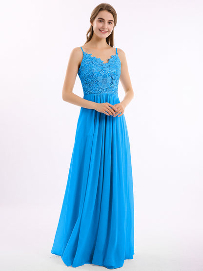 Lace and Chiffon Long Dresses with Spaghetti Straps Ocean Blue
