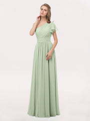 One Shoulder Flutter Sleeve Chiffon Gown Dusty Sage