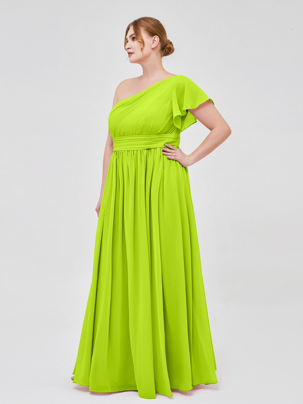 One Shoulder Flutter Sleeve Chiffon Gown Lime Green