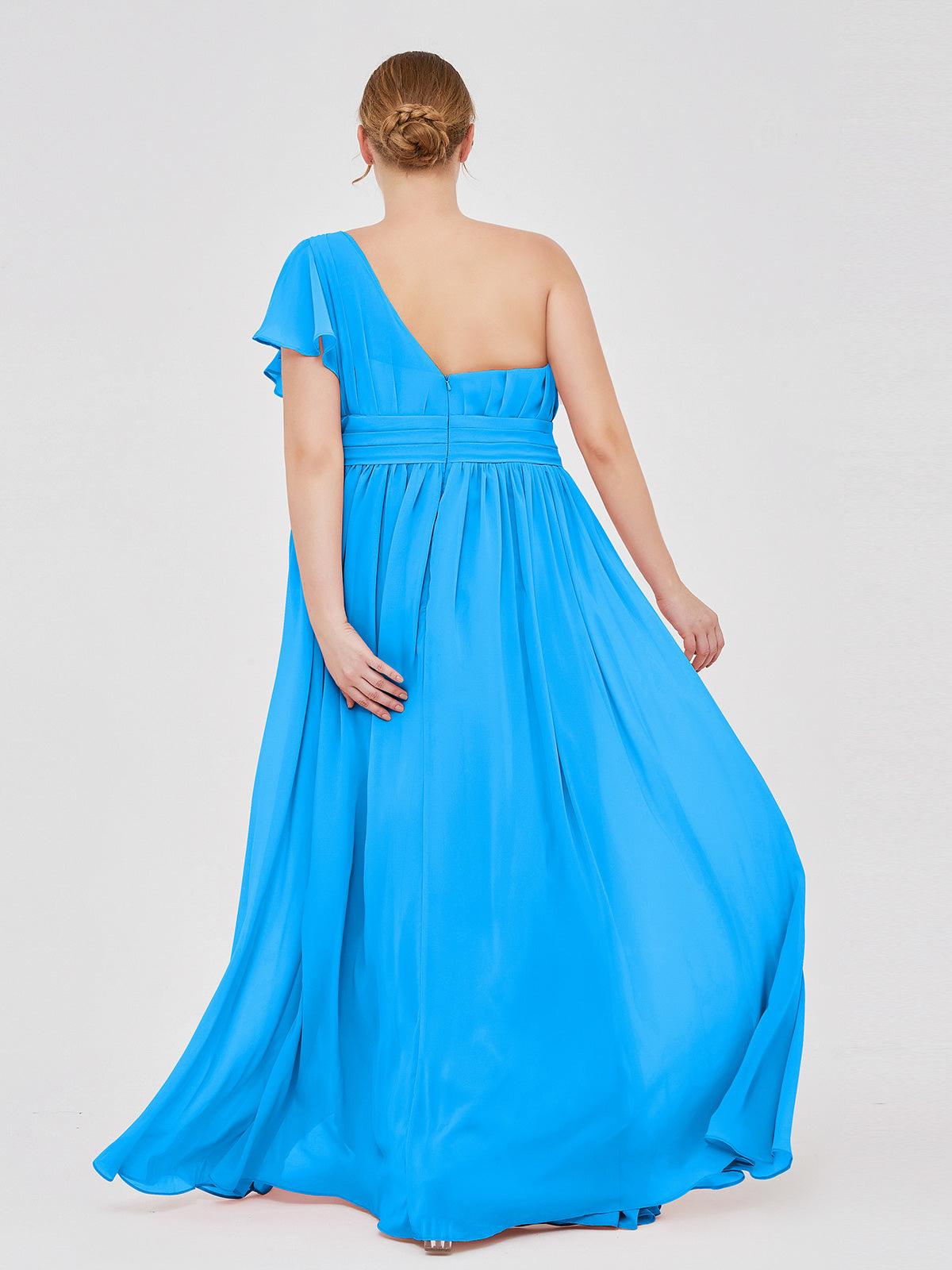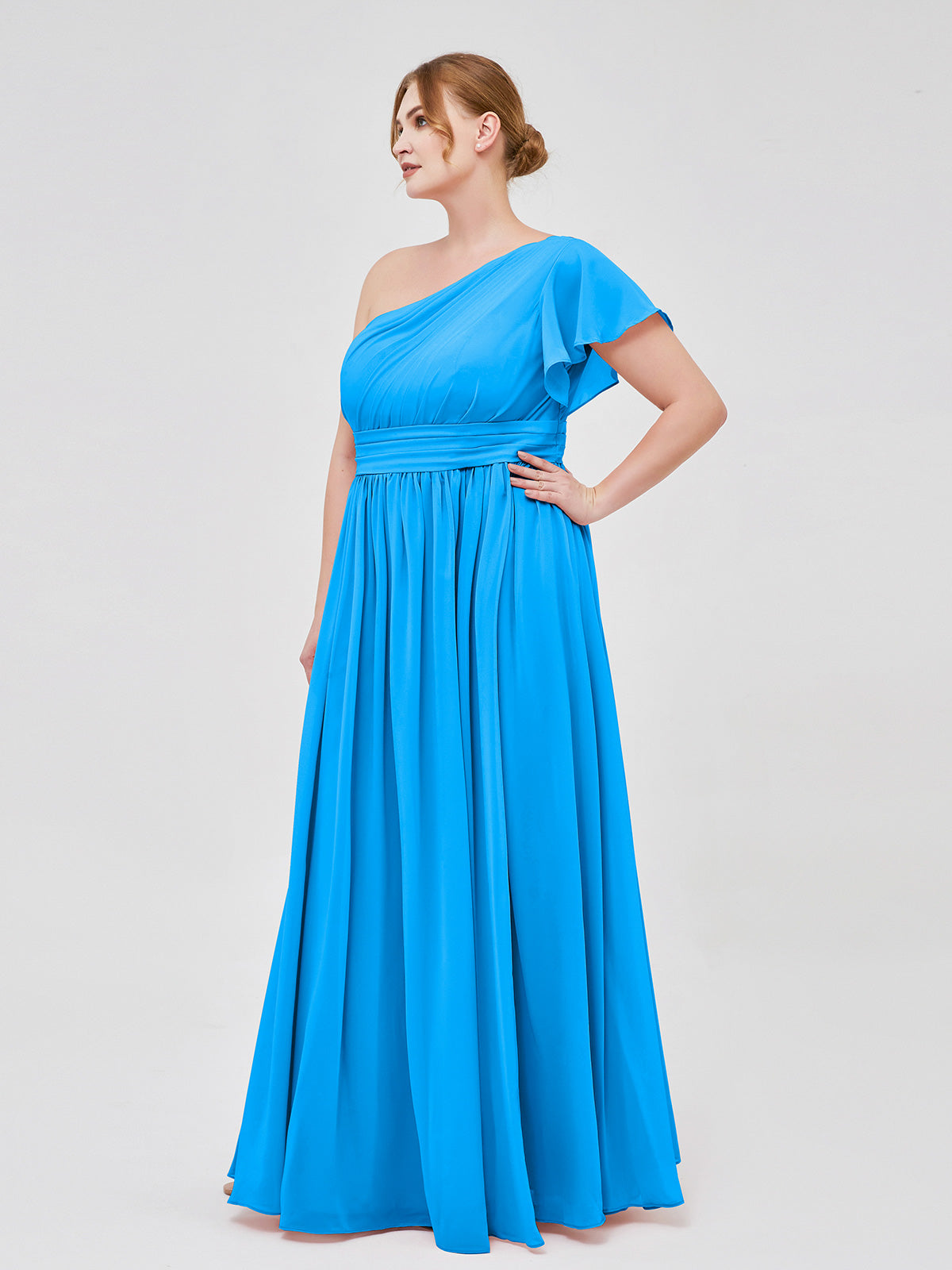 One Shoulder Flutter Sleeve Chiffon Gown Ocean Blue