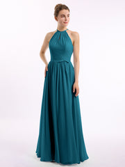 Long Halter Chiffon Dresses with Open Back Ink Blue