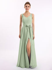 V neck Chiffon Bow Sash Gowns with Split Dusty Sage