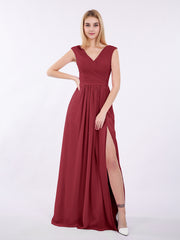 V Neck Chiffon Gown with Cap Sleeves Burgundy