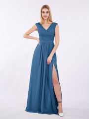 V Neck Chiffon Gown with Cap Sleeves Ink Blue