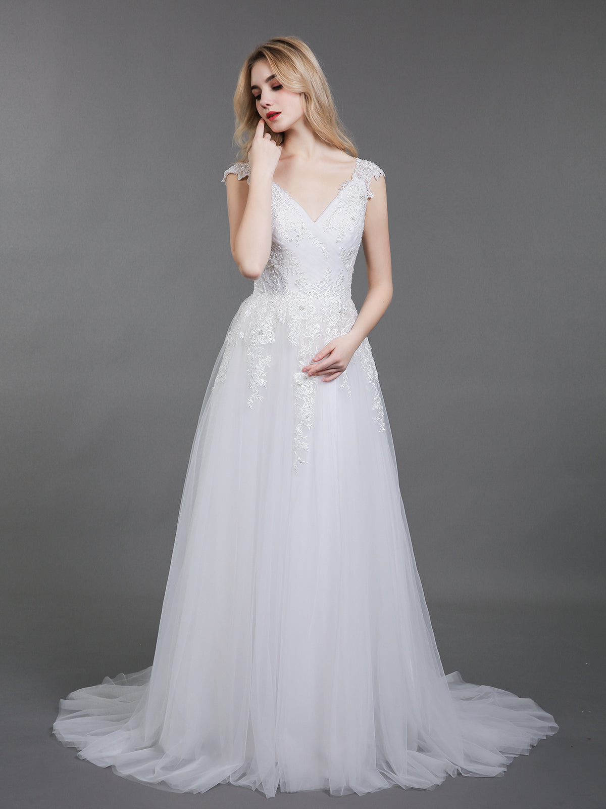Open Back Tulle Bridal Gown with Cap Sleeves-Ivory