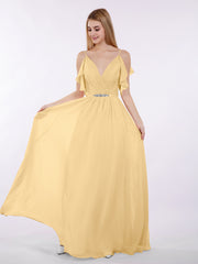 Spaghetti Strap Chiffon Dress with V-neck-Gold