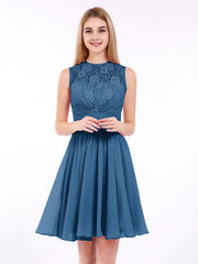 Illusion Neck Chiffon and Lace Dress-Ink Blue