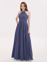 Chiffon Maxi Halter Dress with Lace Bodice-Stormy