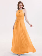 Halter Long Chiffon Dress with Pleated Waist-Tangerine