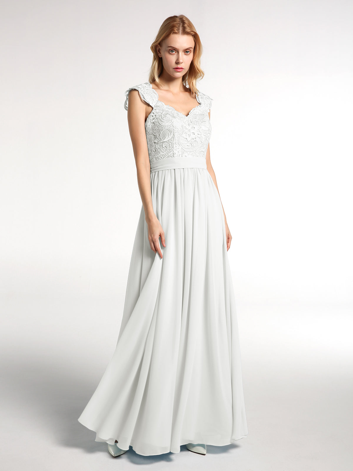 • This dress is made of chiffon with a lace bodice and lace cap sleeves.