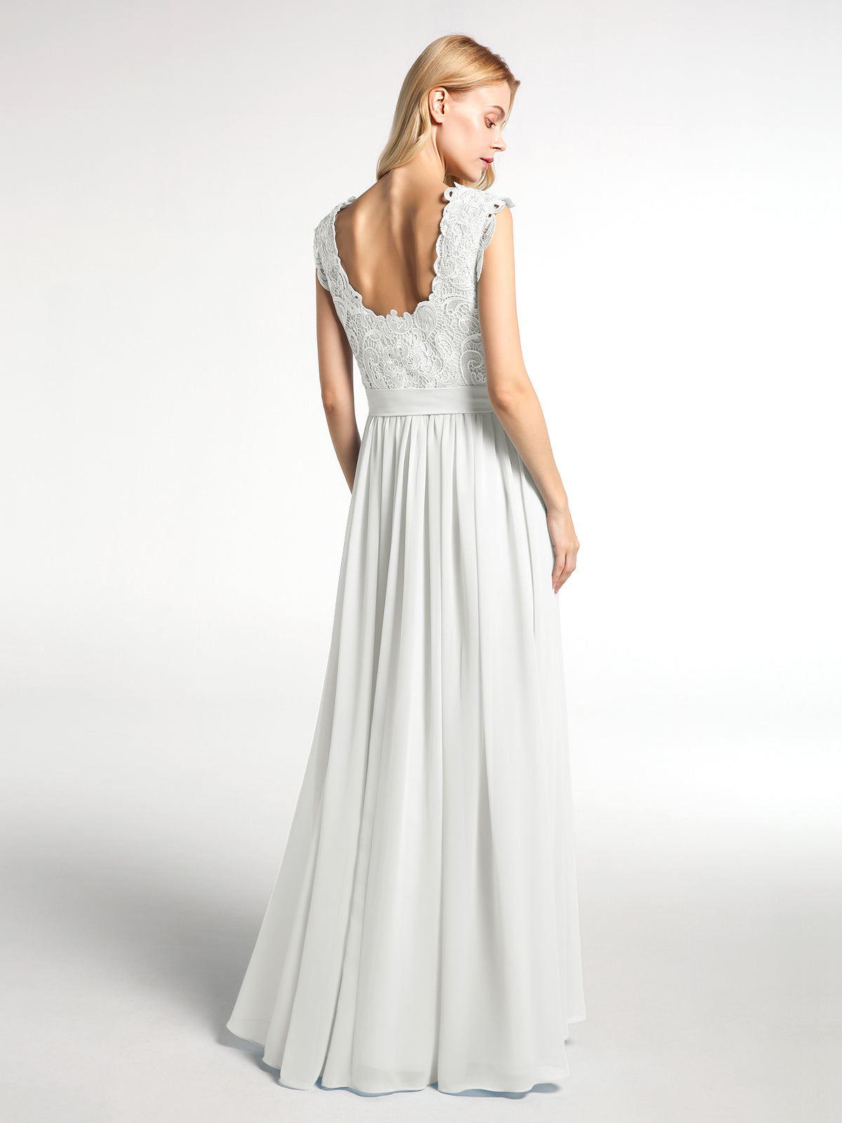 Long Chiffon Dress with Lace Appliqued Bodice-Ivory