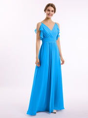 Spaghetti Strap Ruffles V-neck Chiffon Dresses Ocean Blue