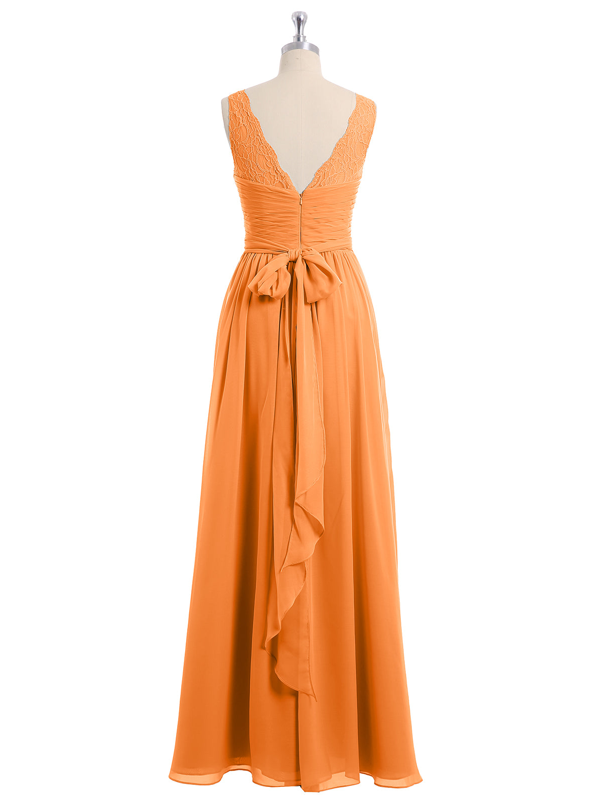 Lace Straps Long Chiffon Dresses with Bow Sash-Orange Plus Size