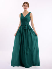 Lace Straps Long Chiffon Dresses with Bow Sash-Peacock
