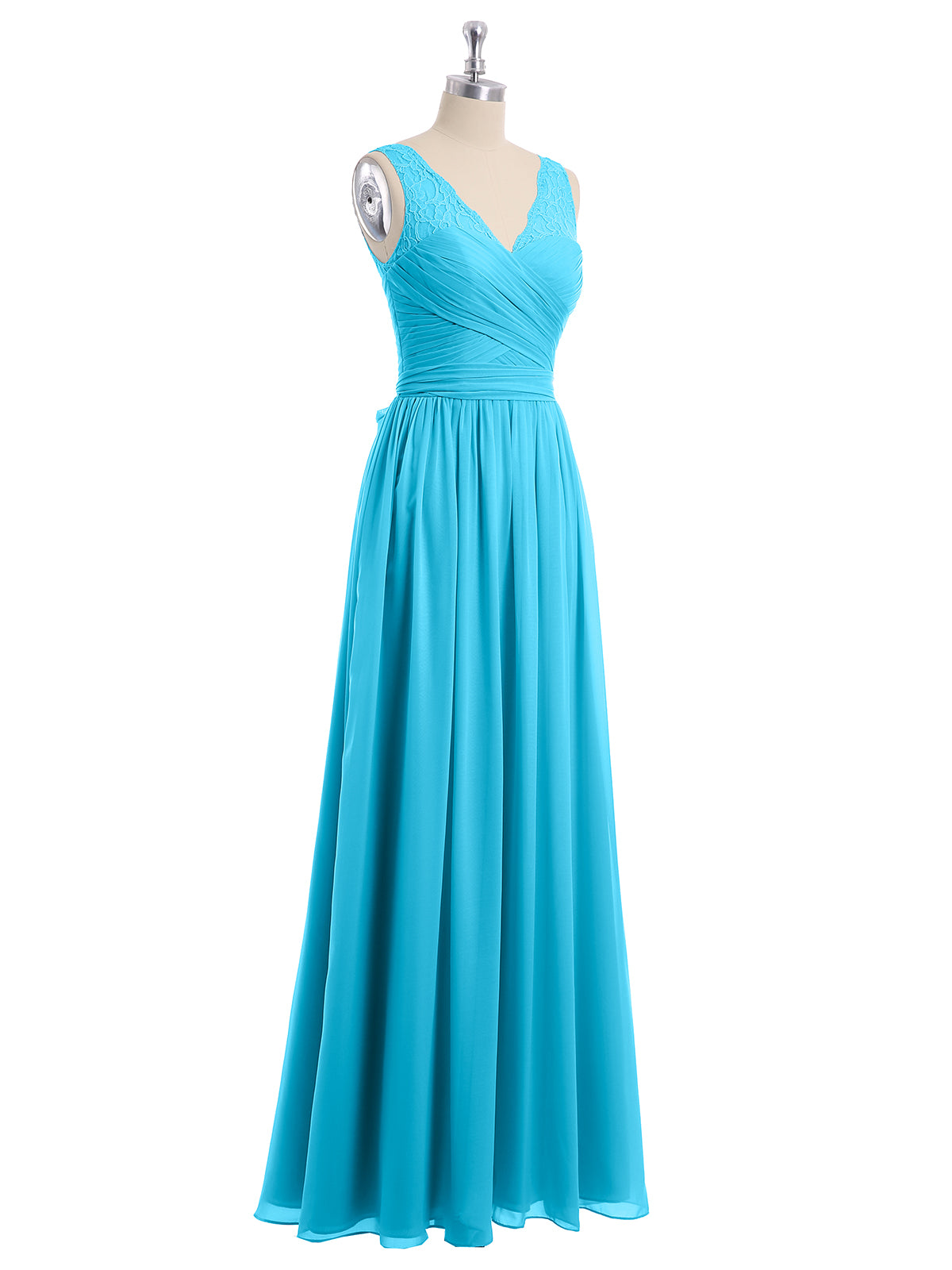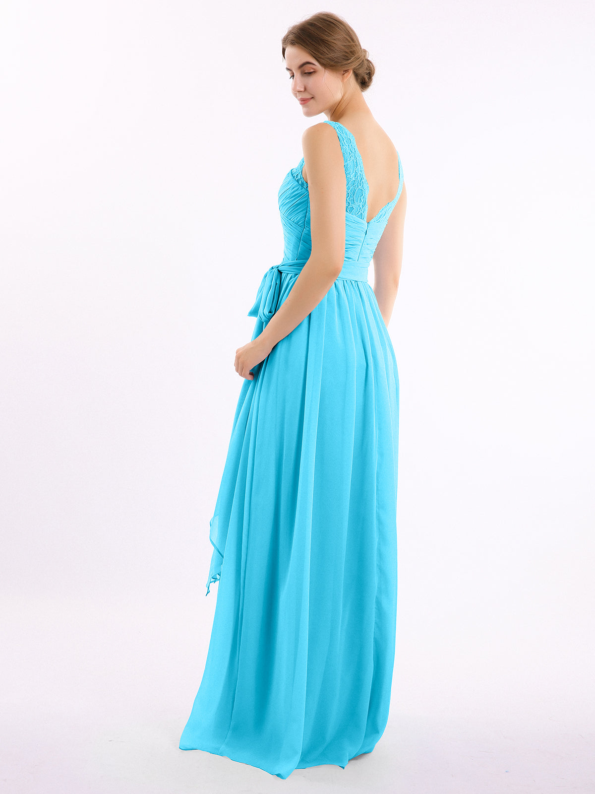 Lace Straps Long Chiffon Dresses with Bow Sash-Pool Plus Size