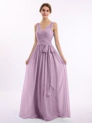 Lace Straps Long Chiffon Dresses with Bow Sash-Wisteria