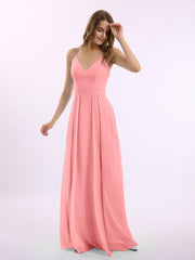 Spaghetti Strap V-neck Chiffon Gowns with Pocket-Flamingo