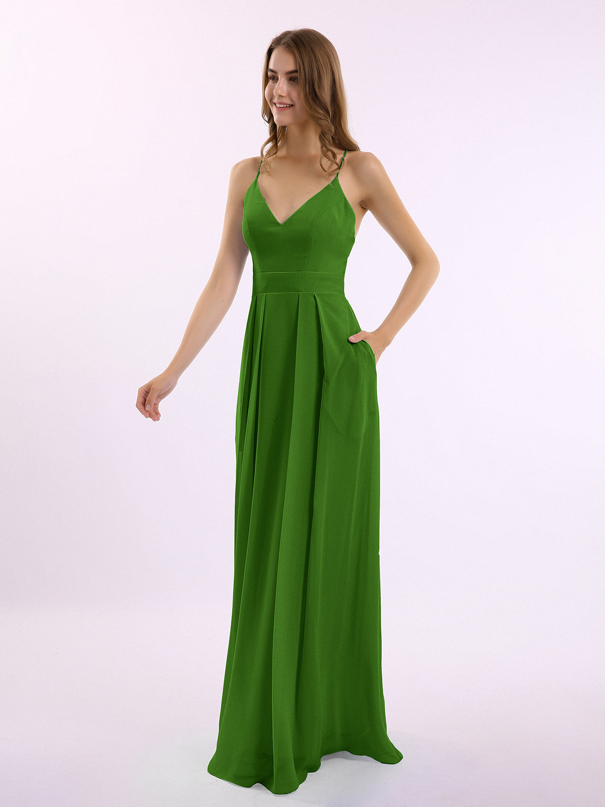 Spaghetti Strap V-neck Chiffon Gowns with Pocket-Moss Plus Size