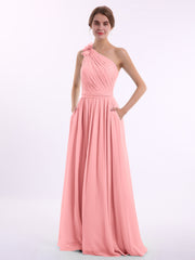 • This floor-length dress features a special one shoulder design decorated with a flower. You will look different and special from the crowed.