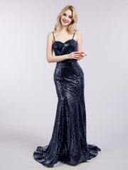 Spaghetti Strap Sequins Mermaid Dress-Dark Navy