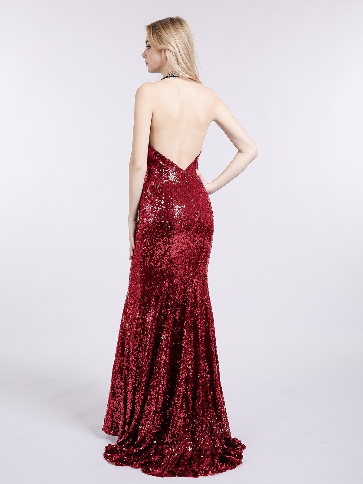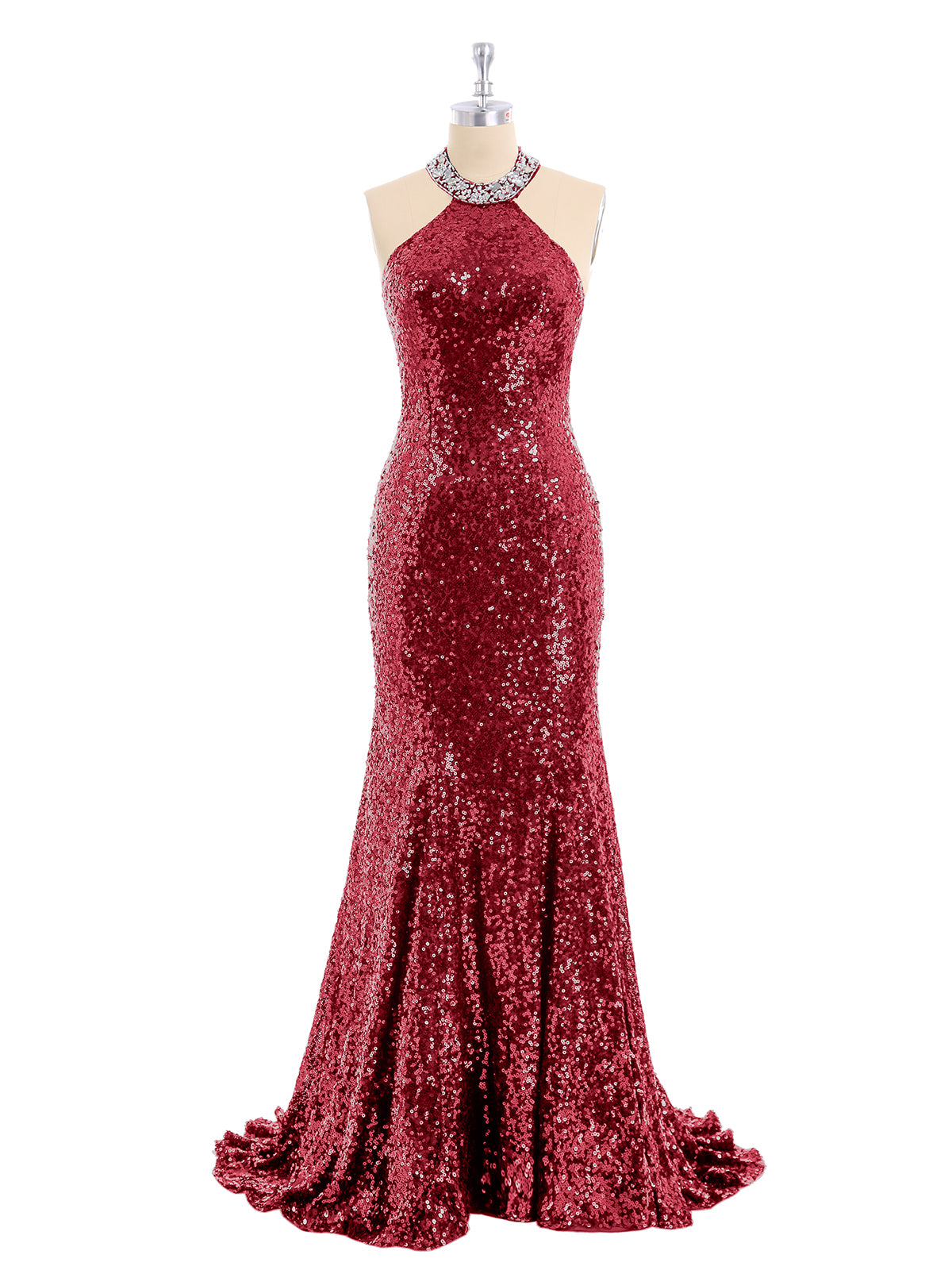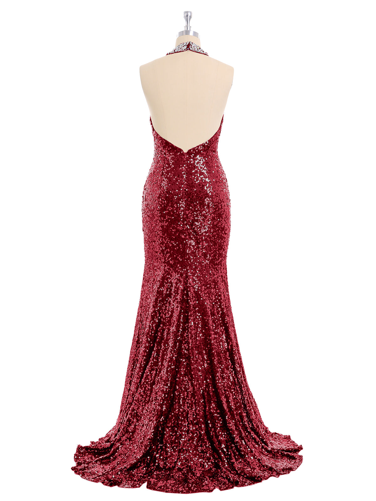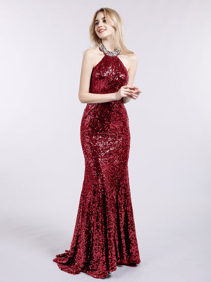 Halter Lower Back Sequins Mermaid Gown-Burgundy
