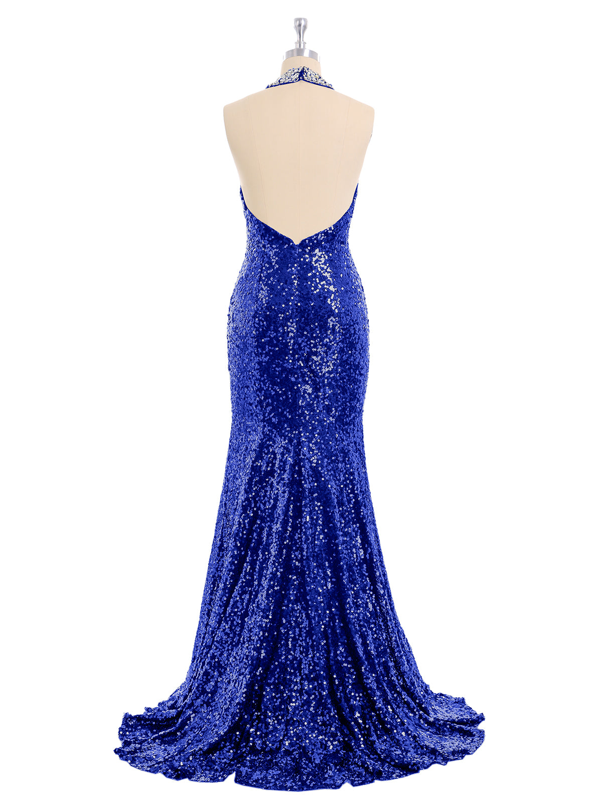 Halter Lower Back Sequins Mermaid Gown-Royal Blue Plus Size
